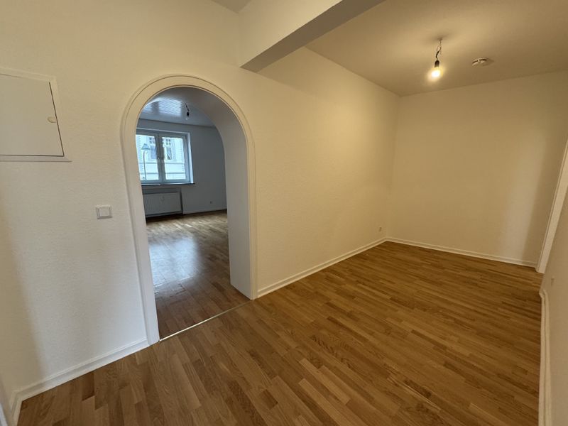 Betreten Sie die Wohnung und lassen Sie sich von der großzügigen Raumaufteilung begeistern. Ein lichtdurchfluteter Wohnbereich lädt zum Verweilen und Entspannen ein, während die angrenzende Küche ausreichend Platz für kulinarische Abenteuer bietet. Die hohe Decke und die großen Fenster schaffen eine einladende Atmosphäre, die jeden Raum zum Leben erweckt.